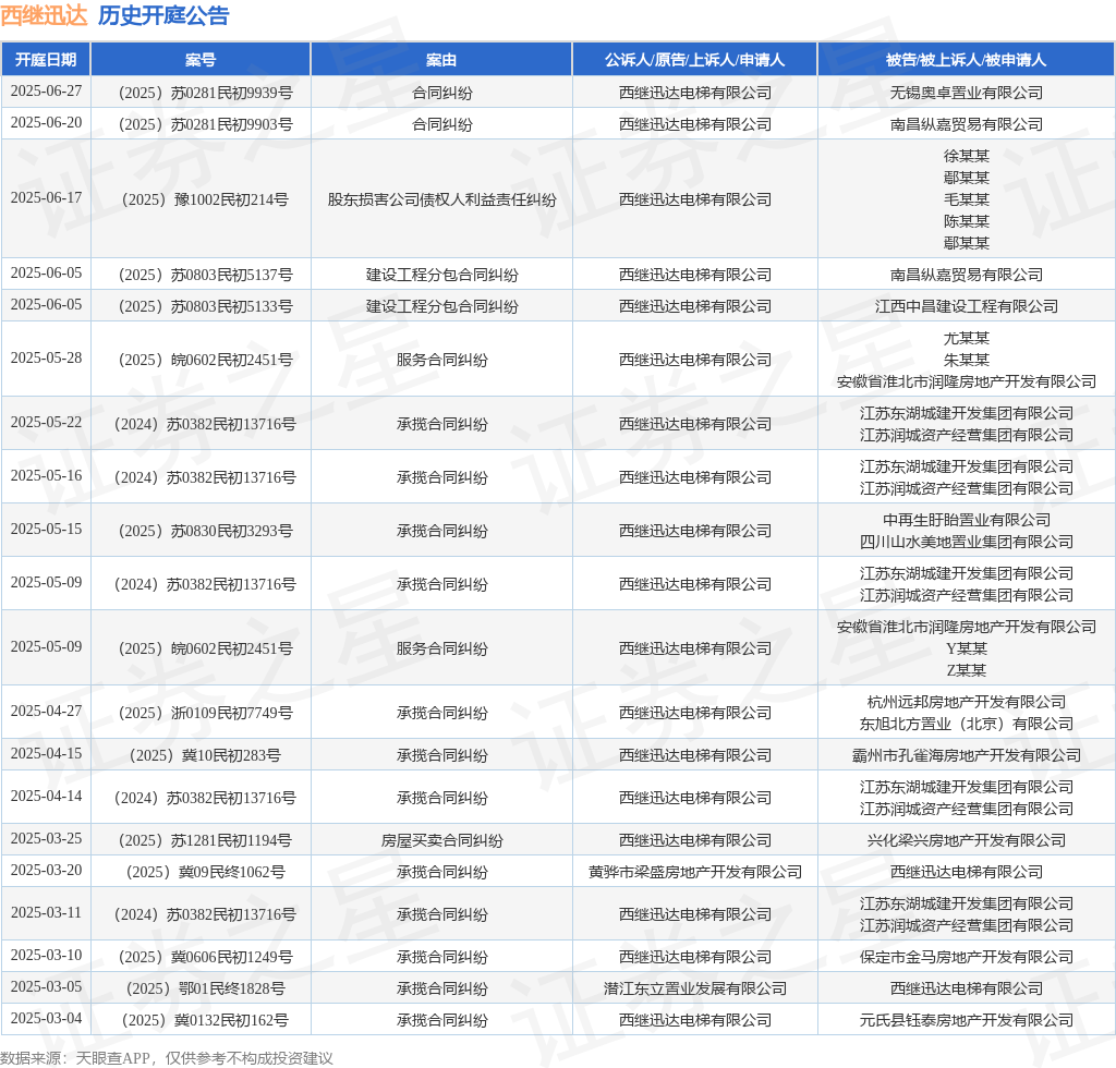 根据统计,近一年内以西继迅达电梯有限公司为当事人的历史开庭公告有94则,其中案由为“承揽合同纠纷”的公告以43则居首,其次为“服务合同纠纷”有16则,“买卖合同纠纷”有9则。历史开庭公告(前20条)如下: